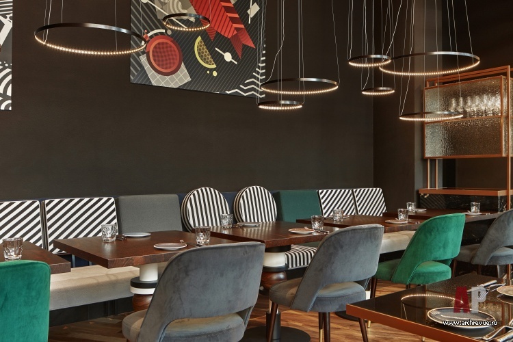Поэтому едва ли не главными декоративными акцентами пространства стали арт-объекты: зебра, жираф, рыбы, набранные с помощью простых геометрических фигур. Каменный пол, на котором словно отпечатались следы животных, идущих на водопой, текстиль со «звериным» принтом, оформление колонн стилизованными изображениями шкур животных – все эти природные детали решены в эстетике функционализма с элементами поп-арта. Фоном для них являются строгие геометричные формы Баухауса, жесткая графика смягчается роскошными материалами: кожей, медью, мрамором, ониксом. Авторские светильники, LED-экраны, светодиодные панно дополняют облик модного заведения в молодежном центре Берлина.
