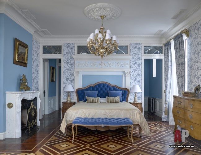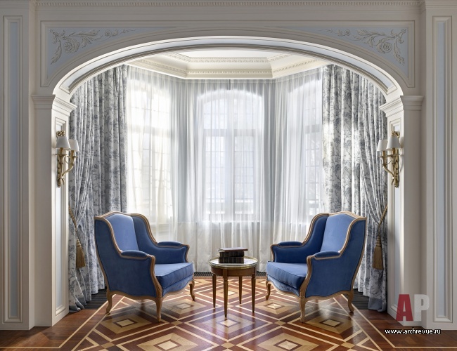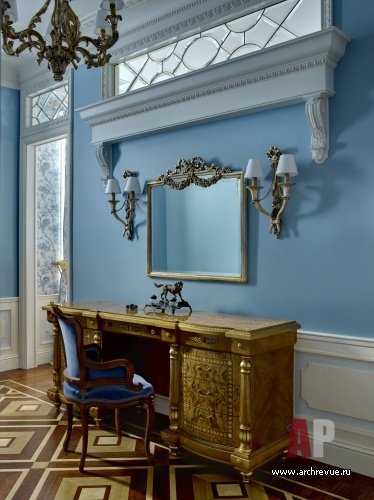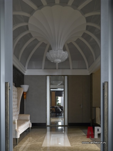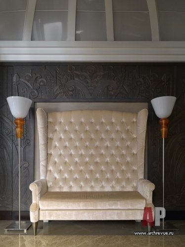 Главная художественная идея дома – его стилистическое многообразие. За основу декоративных решений представительских помещений первого этажа авторы проекта взяли стилистику американского ар-деко с характерными для него материалами (природным камнем, лакированным деревом, металлом) и изящной орнаментикой. Второй этаж – это дань традиционной классике, помещения здесь оформлены в пышном стиле французского регентства: в декоре мраморных панно, художественного паркета, гипсовых рельефов и классических тяг присутствует крупный геометрический рисунок.