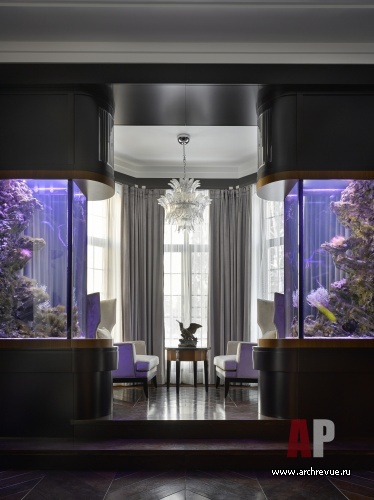 Трехэтажный дом имеет четкую структуру. Нижний этаж занимают общественные помещения. Ядро пространства – парадный холл с арочным потолком и диагональными тягами, из него попадаешь в общее пространство гостиной, столовой и кухни. Декоративным акцентом общей зоны служит морской аквариум, обрамленный деревянными панелями в стиле ар-деко, он отделяет мягкую группу в эркере и рифмуется с формой и отделкой камина.