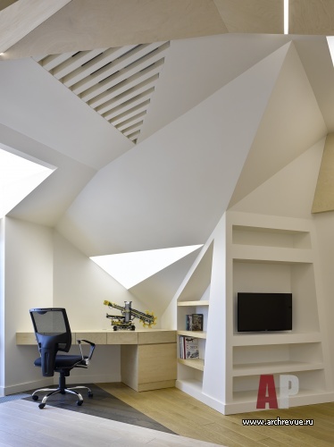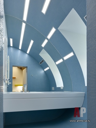 Второй этаж занимают спальни хозяев дома и гостевые помещения со своими ванными комнатами. Третий этаж с высокими потолками отдан детским комнатам и зоне отдыха с кинозалом, баром и сигарной. Когда архитекторы приступили к работе над проектом, они выяснили, что дом имеет большой подвал. В нем они разместили все технические службы (включая мощную систему вентиляции и кондиционирования и коммуникации для аквариума), а также винный погреб.