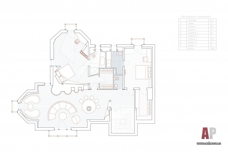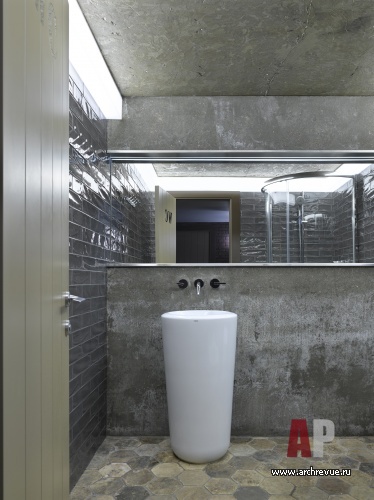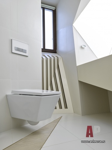 При всем многообразии форм и отделочных материалов сложный эклектичный проект выглядит цельно и органично благодаря оптимальному зонированию и функциональности помещений.