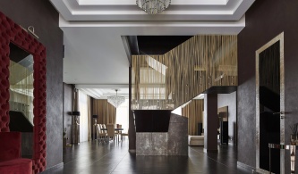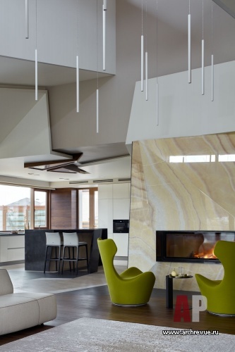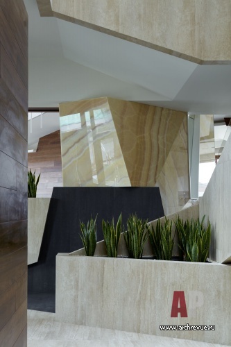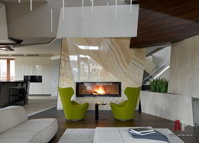 Центральный элемент пространства – скульптурная лестница из монолитного бетона с облицовкой натуральным итальянским ониксом выглядит брутально и элегантно одновременно. Сложный рисунок интерьера также задан естественным орнаментом природных материалов (дерева, камня), формой дизайнерской мебели, вертикалями и горизонталями линейных светильников. Жесткую геометрию смягчают натуральные фактуры, нейтральная цветовая гамма и обилие «живой» зелени.
