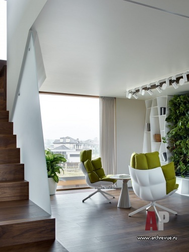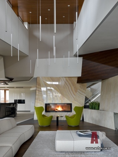 Сложное многоуровневое пространство с перепадом высот и острыми углами в плане требовало интерьера яркого и нестандартного, но в то же время дружелюбного и комфортного для жизни семьи. Архитекторы исполнили проект в фирменном стиле бюро с элементами модернизма и современного дизайна, они наполнили нетривиальный объем теплыми природными фактурами и цветами.