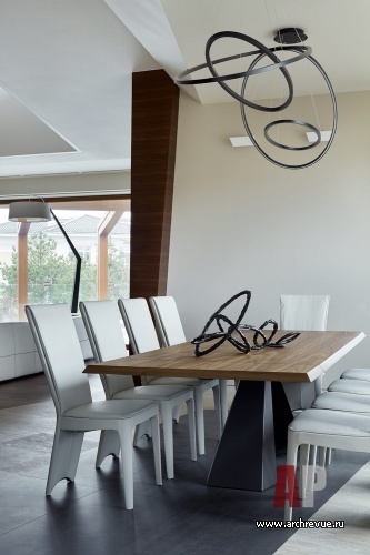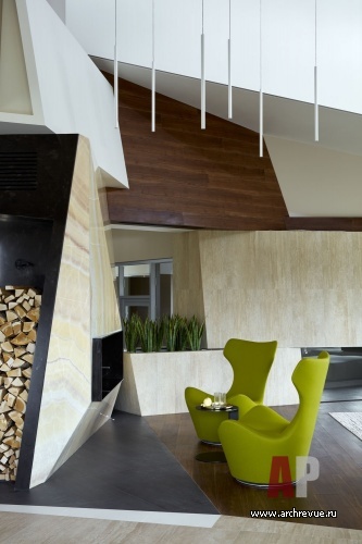 Декоративное наполнение дома подчинено его сложному объемно-пространственному решению. В оформлении гостиной архитекторы использовали характерные для их творчества геометрические принципы: сложные объемы, большие заливки, словно отсеченные гигантским инструментом плоскости, собранные под разным углом с небольшим сдвигом…