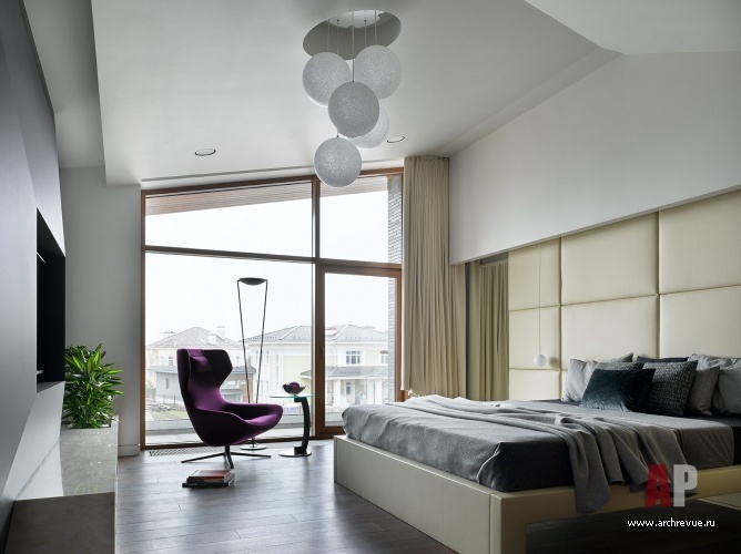 Дом имеет сложную структуру: пространство организовано на трех основных уровнях, кроме того каждый этаж имеет перепад высот с системой подиумов и разнообразными нестандартными углами в плане. Столь непростой, изломанный объем нуждался в интерьере, идеально вписанном в заданные параметры.