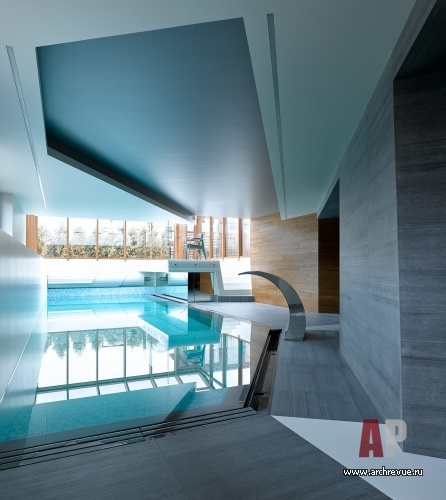 Архитекторы работали практически без чертежей, с листа, а точнее по 3D –визуализациям, но с предельно детальной проработкой. Первый этаж разделен центральной лестницей на две больших части: общие помещения (гостиная с камином, столовая и кухня) и блок частных помещений. Он включает две гостевые спальни и технические комнаты с отдельным входом. Второй этаж занимает приватная гостиная-зимний сад с вертикальным озеленением, две спальни, детская и кабинет с великолепными панорамными окнами. Компактный третий этаж занимает бильярдная. В сложном, изломанном объеме цоколя находится бассейн (с ленточным остеклением), в темной части спроектированы сауна и хаммам.