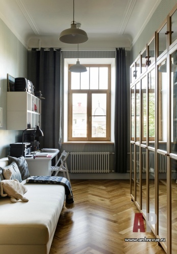 Однако данная квартира имеет угловое расположение и помимо 16 окон в ряд по одному фасаду имеет полукруглый эркер с балконом. В нем архитектор предложила разместить хозяйскую женскую спальню. Рядом с ней находится еще одна спальня (мужская) и небольшая гостевая, а вся левая часть прямоугольного объема отдана гостиной и кухне. Эти помещения изолированы, но имеют общий анфиладный проход, который в коммунальную бытность был заложен. Перепланировка также включала объединение санузлов в один большой и создание гардеробной комнаты.
