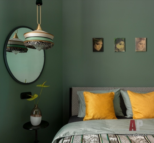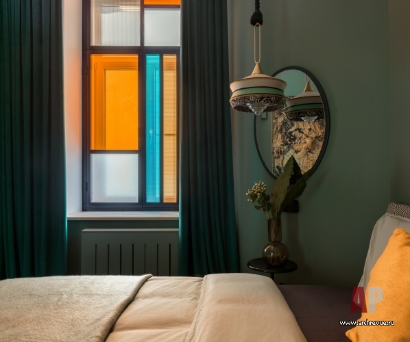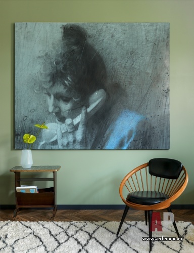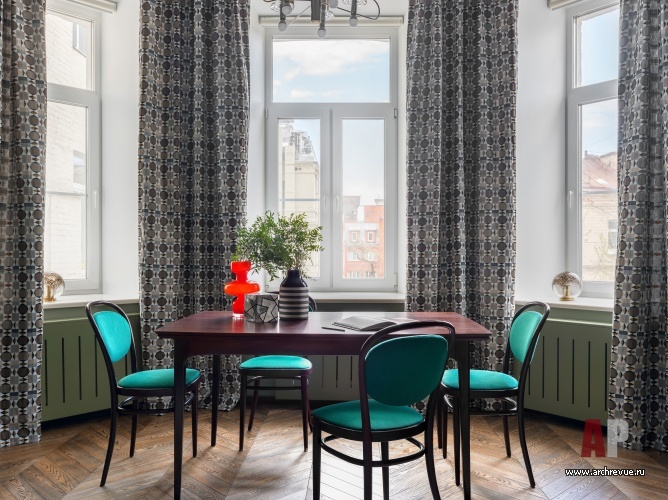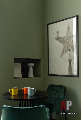 Основной идеей проекта стала яркая цветовая гамма, и, прежде всего, насыщенный цвет стен, на котором гармонично смотрятся предметы искусства. Дизайнеры использовали прохладные тилловые оттенки: густой сине-бирюзовый, оливково-зеленый, изумрудный, аквамариновый, нефритовый… Сочная колористика стала отличным фоном для необычного симбиоза старой московской классики (высокое потолки, удлиненные двери с фрамугами, паркет-«елочка») и конструктивизма.