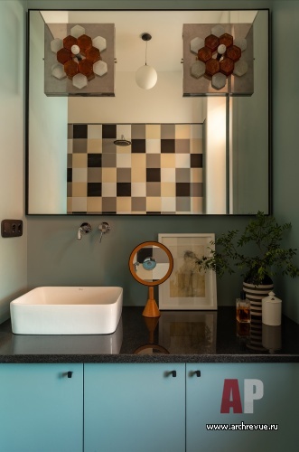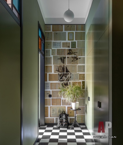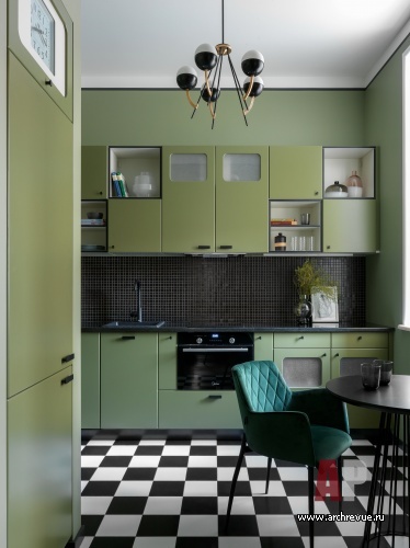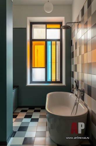 Черная графика потолочных карнизов, порталов дверей, шахматного пола, обтекаемые формы кухонной мебели, а главное – абстрактные витражи яркой расцветки – отсылают к авангардным экспериментам ХХ века. «Мы очень любим винтажные предметы мебели и осветительные приборы и часто используем их в своих интерьерах. Так было и в этом проекте», - добавляют дизайнеры.