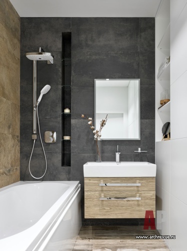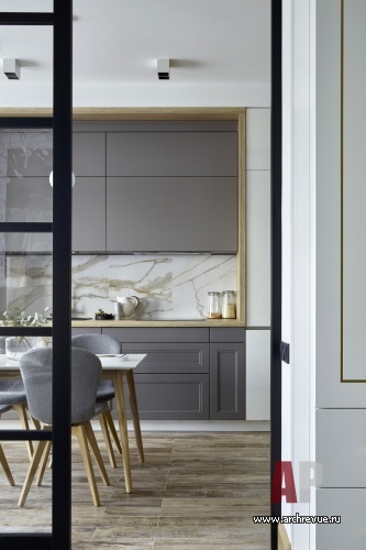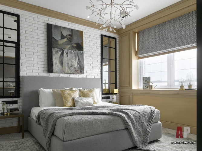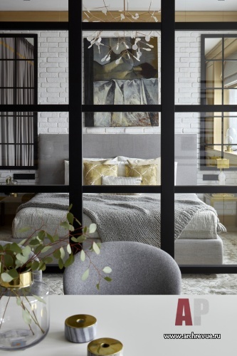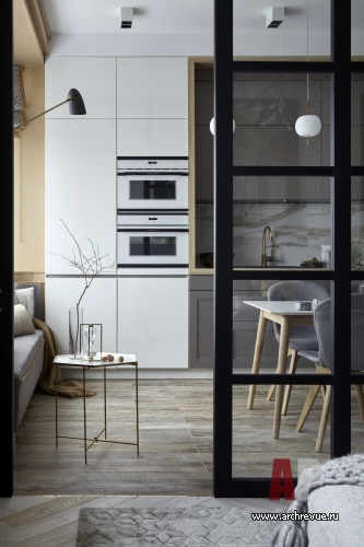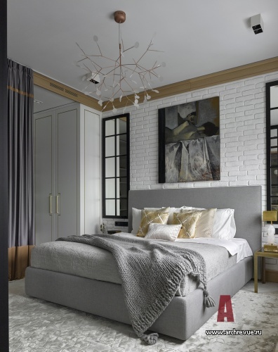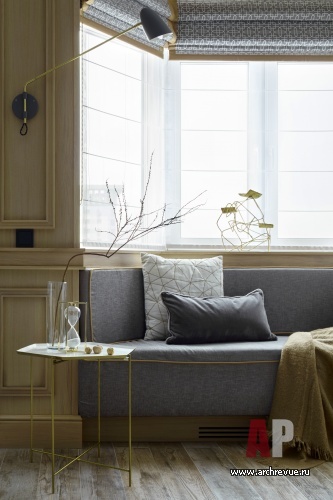 «За основу идеи мы взяли концепцию квартиры-«шкатулки» с секретом. Здесь нет однотонных гладких стен, каждая поверхность имеет нюансный декор: деревянные панели, кирпичная плитка, зеркала, молдинги, латунная отделка встроенной мебели, - рассказывает дизайнер. – Все это нужно затем, чтобы из небольшой квартиры сделать интересное пространство, которое интересно рассматривать из любой точки». Значительную часть мебели, встроенные шкафы, перегородку, буазери архитектор сделала по эскизам на собственном производстве, материалы выбирала c природной текстурой, ткани исключительно натуральные. За счет разнообразия фактур и «чистоты» отделки квартира с общей серой и охристо-бежевой палитрой выглядит просторной и светлой.