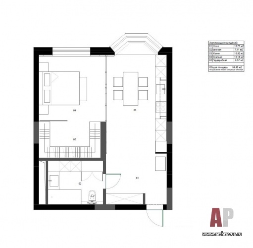 В небольшой квартире площадью 54 кв. м. архитектору удалось разместить все необходимые для комфортного проживания зоны: гостиную с кухней, спальню с большой кроватью, ванную комнату со встроенной техникой, полноценную гардеробную и скрытые системы хранения.