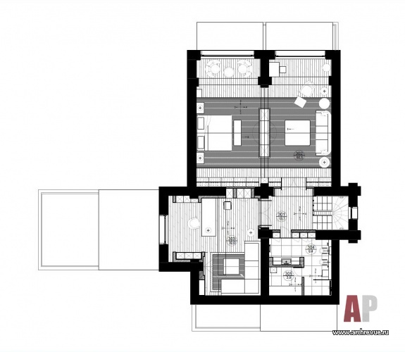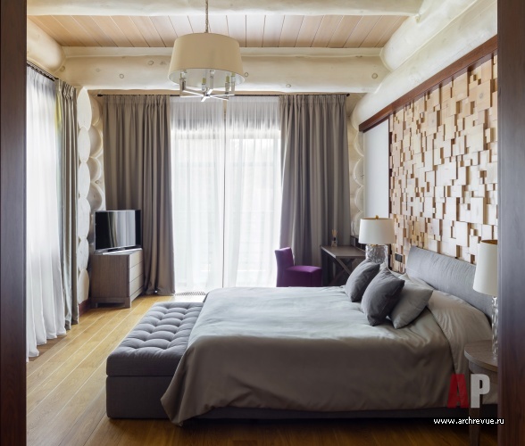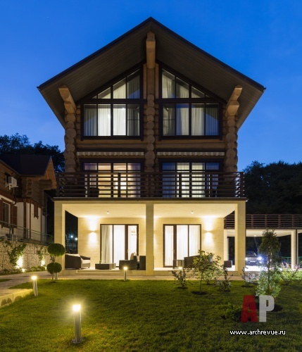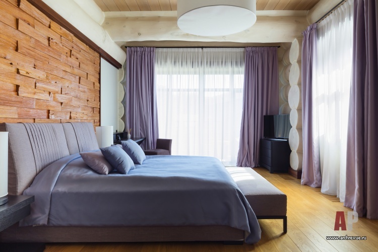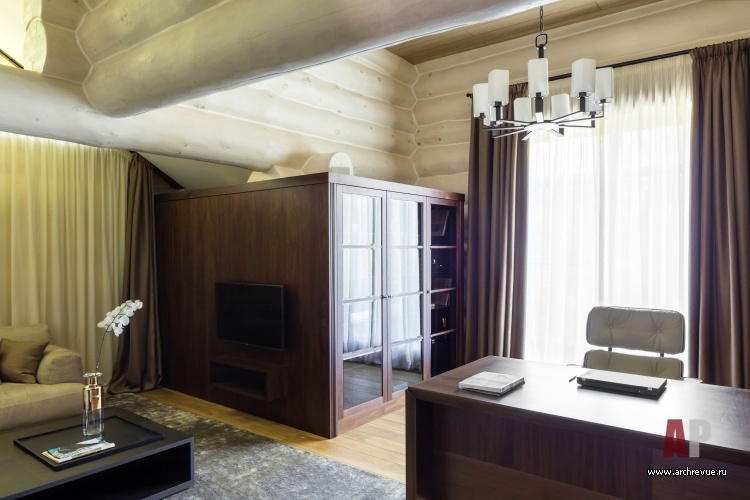 Дом задумывался как место для временного проживания, поэтому основное внимание уделялось созданию максимально комфортной среды для отдыха. Кроме того, поскольку заказчик планировал приглашать гостей, то интерьер следовало сделать эффектным и статусным. За основу была взята стилистика американского ар-деко, адаптированного к особенностям деревянной архитектуры.