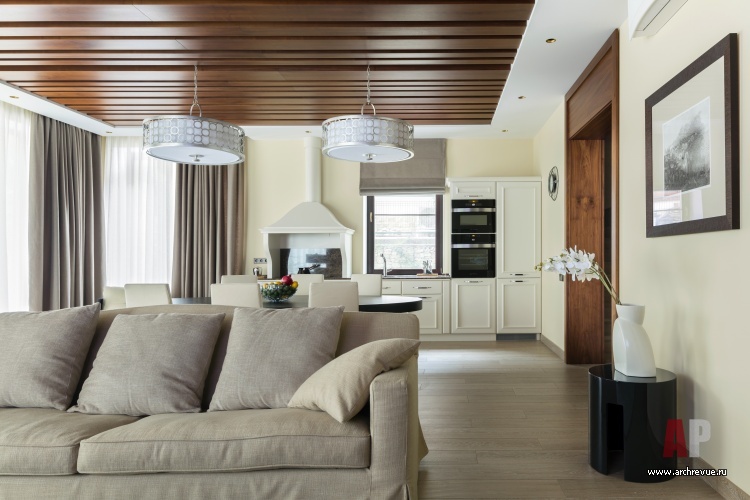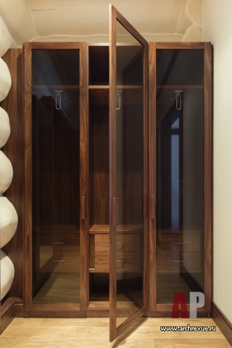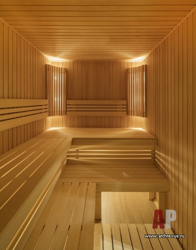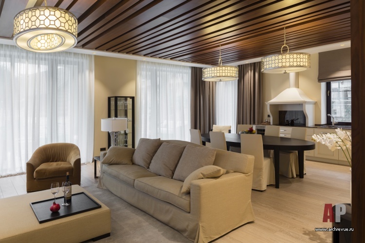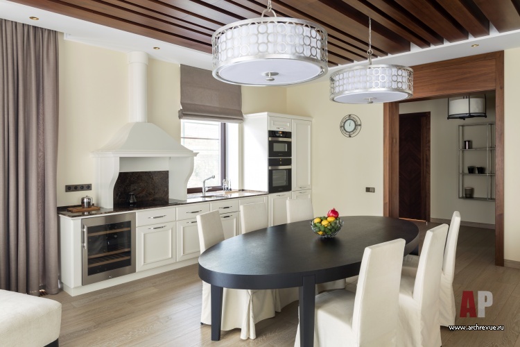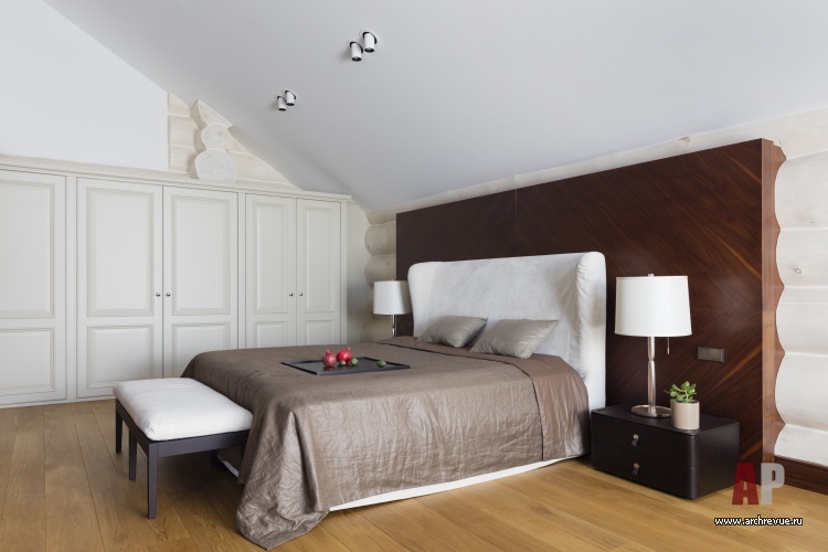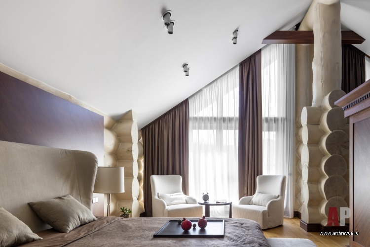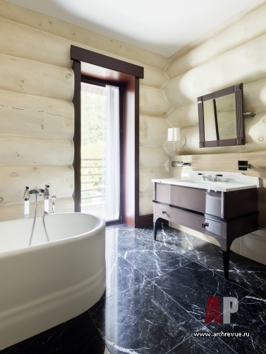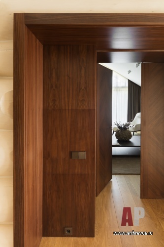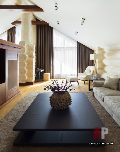 Массивные бревенчатые стены авторы проекта предложили выбелить (хотя первоначально заказчик хотел сделать бревенчатую кладку желтоватой), что в итоге позволило создать современное, светлое и воздушное пространство. Стены первого этажа выкрасили в светлый бежевый оттенок, в тон к нему подобрали цвет плитки с фактурой дерева, которой облицевали пол в общих помещениях. «Поскольку дом не предназначен для постоянного пребывания, мы выбирали практичные отделочные материалы, которые не требуют постоянного ухода, - отмечает Иван Качалов. – Плитка под дерево дает ощущение тепла и уюта и в то же время легко чистится от загрязнений. Кроме того выбор в пользу плитки дал нам возможность сделать «теплый пол», что повысило уровень комфорта: по теплому шершавому полу прекрасно ходить босиком, когда за окном снег». Стильный вид экологичному интерьеру придает обилие темного дерева: дверные порталы, двери, стеновые панели, потолочные конструкции, перегородка третьего этажа, встроенная мебель сделаны из шпона ореха по эскизам архитекторов на московском производстве. Балки, встроенные элементы и декоративные накладки из темного дерева были придуманы для маскировки конструктивных огрехов застройщиков и следов усадки дома, но превратились в эффектные акценты курортного интерьера.