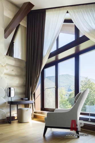 Архитекторы Иван Качалов и Игорь Метелкин недалеко от Сочи оформили частный загородный дом для отдыха и катания на лыжах в горах. «В работу нам достался готовый трехэтажный коттедж, который выглядел основательно и брутально и больше всего напоминал форт из исторических кинофильмов, - вспоминает Иван Качалов. – Нижний этаж дома полностью выполнен в монолите, два верхних сложены из оцилиндрованного бревна алтайского кедра диаметром едва ли не полметра…»