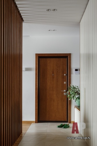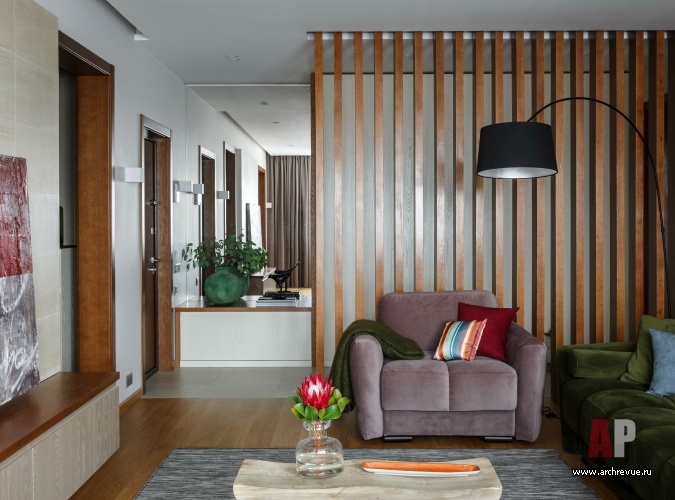 Квартира 90 кв. м в плане имеет сложную конфигурацию, она состоит из ступенчато расположенных удлиненных объемов. Чтобы увеличить площадь и зрительно расширить помещения, было решено снести стену между прихожей и гостиной и возвести на ее месте перегородку из вертикальных шпонированных стоек, которая работает на просвет.