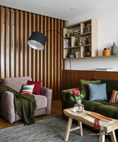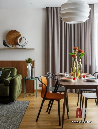 «Мне захотелось создать для заказчиков интерьер с вдумчивым настроением, располагающий к отдыху и уютным вечерам, но при этом яркий и энергичный. Так появился образ светлого пространства с натуральными фактурами дерева и камня, с добавлением ярких красок в декоре. Пожелания самих заказчиков были довольно общими: светлое и уютное пространство с достаточным количеством мест хранения», - рассказывает автор проекта.