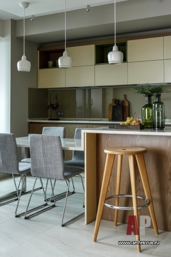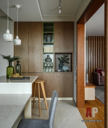 Интерьер выполнен в спокойной, комфортной цветовой гамме на базе серых, молочных, трюфельных оттенков. Теплую ноту вносит насыщенная фактура и оттенки натурального дуба, они же создают прекрасную основу для ярких цветовых акцентов: бутылочно-зеленого, цвета мха и опавших осенних листьев.