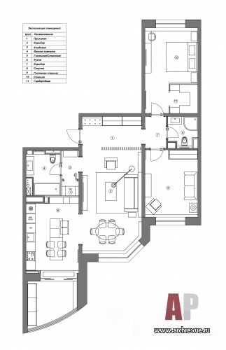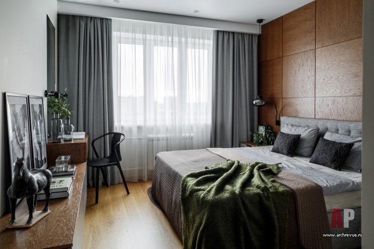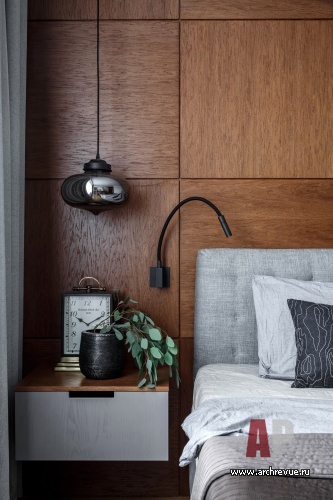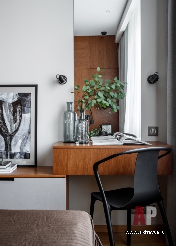 Жесткие линии и четкий ритм вертикальных стоек-разделителей в прихожей и геометрических стеновых панелей в спальне смягчается плавными формами и мягкой фактурой мебели. В итоге строгость линий объемно-пространственных решений компенсируется мягкостью текстиля и дружелюбностью декора.