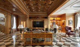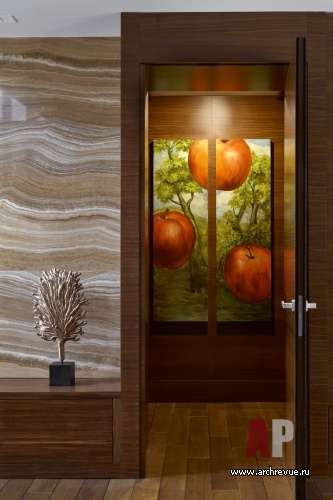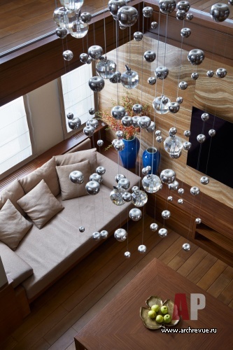 Стеновые панели, потолочные балки, вертикальные перегородки, корпусная мебель, полы и двери созданы на заказ по эскизам дизайнера в едином дизайне. Активное использование встроенной мебели – также дань яхтенному стилю. Украшением графичного интерьера служат светильники в стиле ар-деко и американской неоклассики, а также декоративные настенные панно.