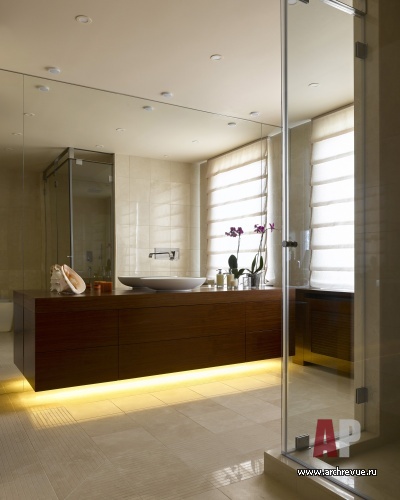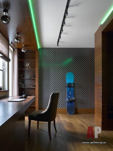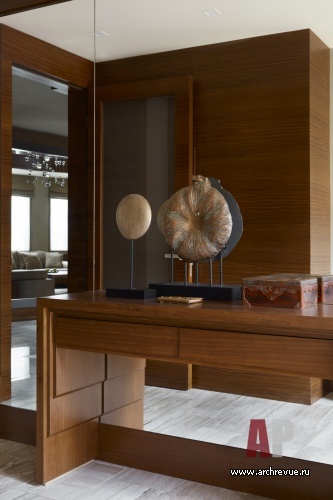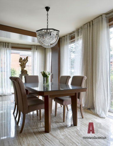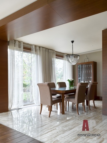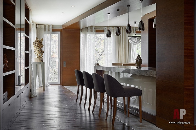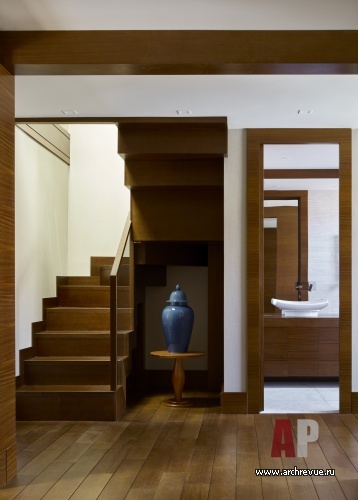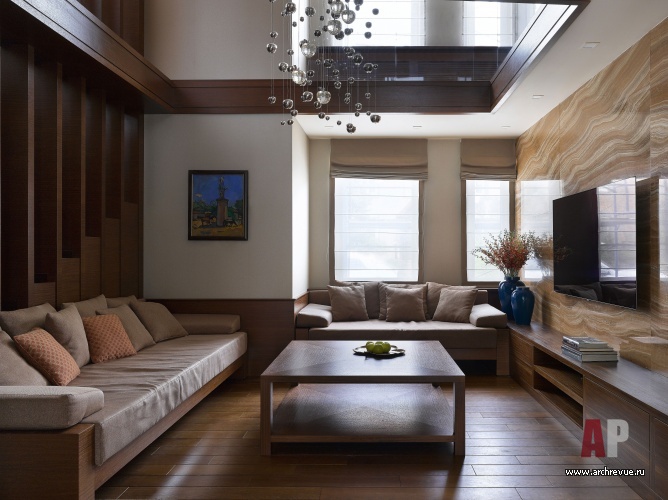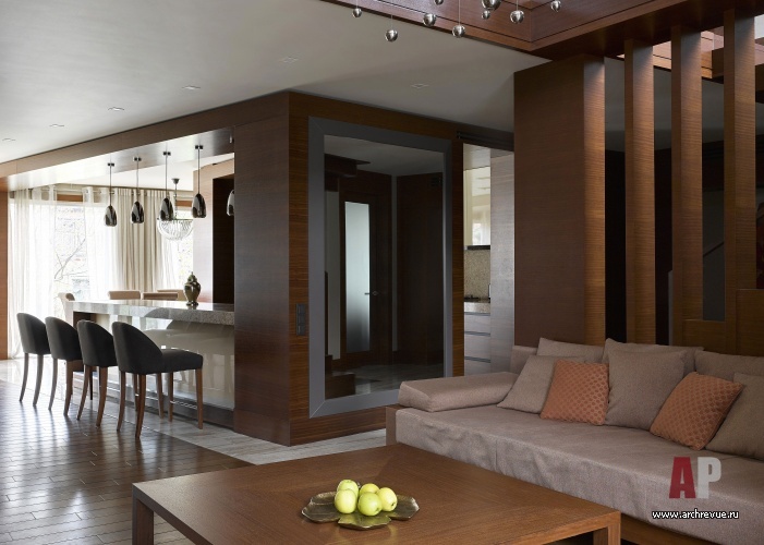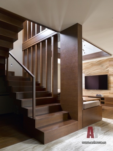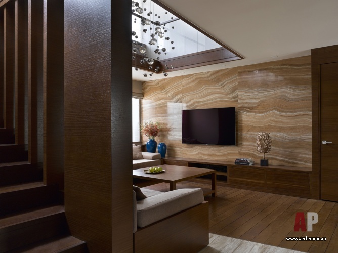 Интерьер дома выполнен в современном стиле с элементами эко-дизайна. Ставка в оформлении сделана на природные материалы с «живой» текстурой: дерево и камень в благородной цветовой палитре. Интерьеры всех помещений связывают изделия из тика – дерева, которое востребовано в дизайне яхт.