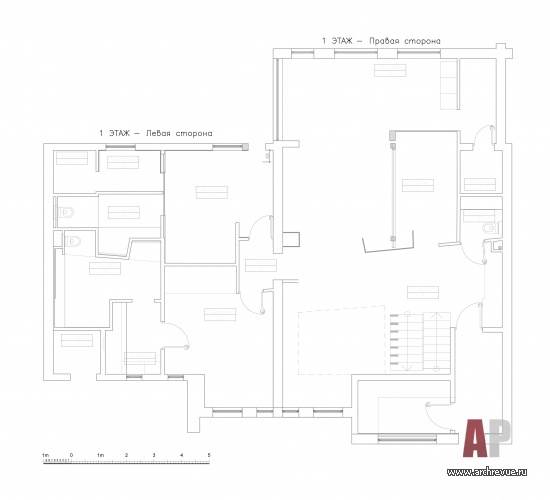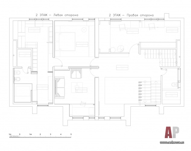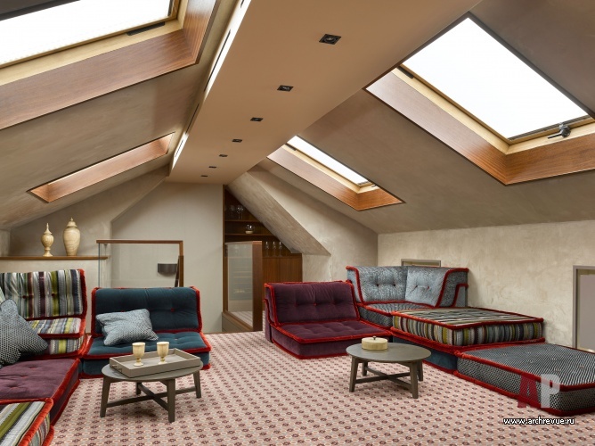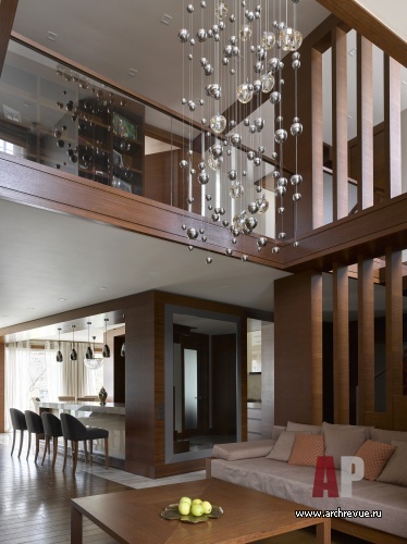 Центральное помещение первого этажа дома – двусветная гостиная, которая сменяется столовой, кухней, лестничным холлом. Все помещения открытые, взаимосвязанные друг с другом, они предназначены для комфортного досуга большой семьи. Кроме общей зоны на первом этаже в отдельном блоке находятся гостевые спальни и ванные комнаты. Верхний этаж занимают хозяйские приватные помещения, малая гостиная и зона отдыха в мансарде.
