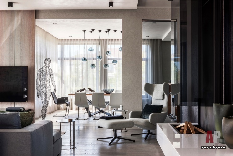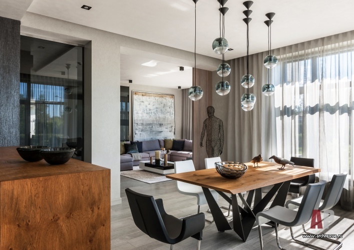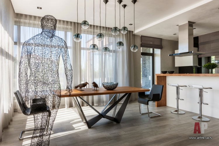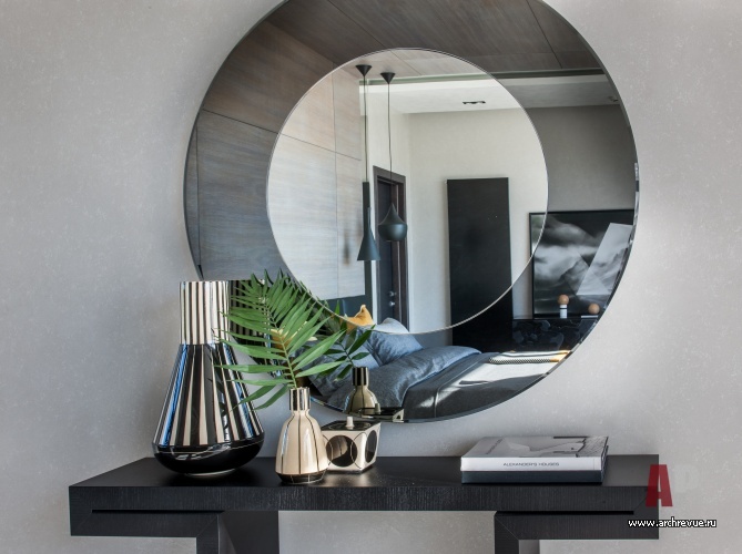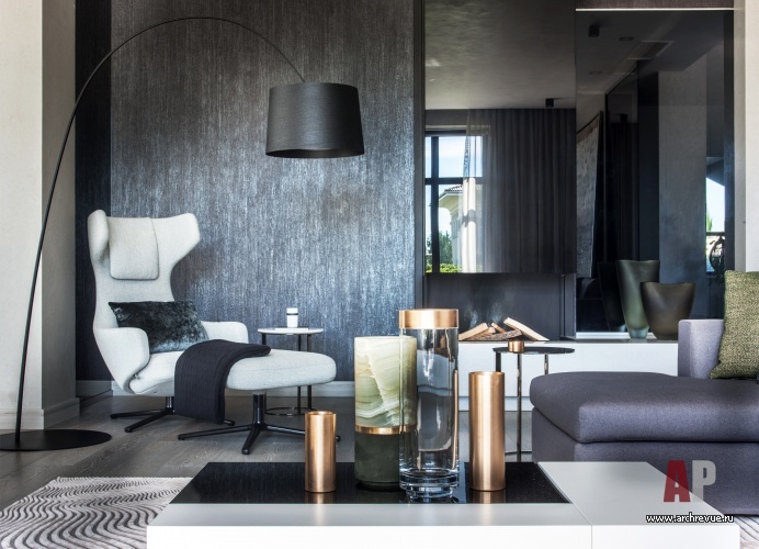 Перед архитекторами стояла задача создать атмосферный интерьер в современном стиле: яркий, стильный, запоминающийся. Но эпатажную сущность следовало выразить через оригинальную архитектуру, нестандартную планировку и оптическую игру с пространством: контраст форм и материалов, сдвиг масштаба, использование зеркальных поверхностей. Арт-объекты, современная живопись, дизайнерская мебель лишь усиливают общее настроение и эмоциональный настрой, заданный объемно-конструктивным решением.