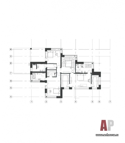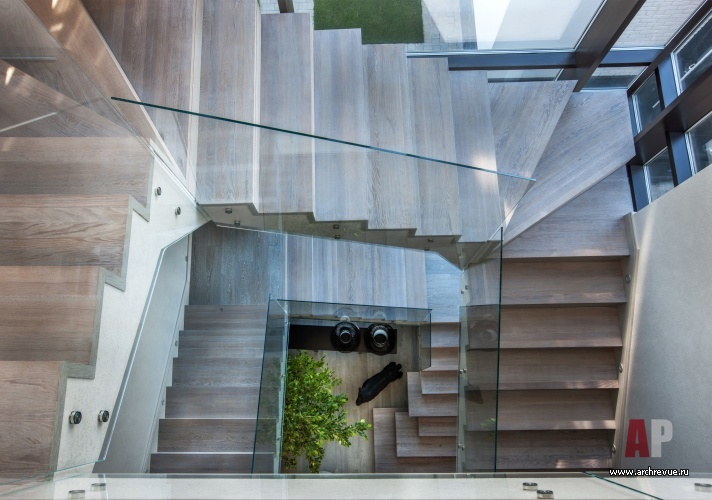 В отдельном крыле расположен гараж на две машины и технические помещения. Второй этаж занимают три спальни со своими ванными комнатами, они выстроены вокруг лестницы, которая заключена в стеклянный объем.