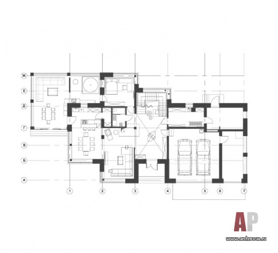 Архитектура двухэтажного дома площадью 300 кв. м. предельно рациональна и удобна для жизни. Стержень первого этажа – черный куб, внутри которого находится гостевой санузел, а снаружи к нему примыкает ультрасовременный камин из закаленного стекла. Вокруг камина группируются жилые зоны: входная группа, гостиная, столовая-кухня. Все помещения открытые, свободные, с панорамными окнами…