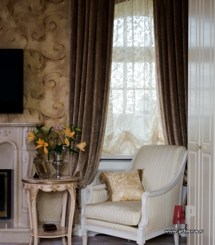 Общественные помещения решены на контрасте белого и черного цветов. Строгая черная кухня, антрацитовый портал камина, черная патина особенно эффектно выглядят на фоне светлых стен, полов и деревянных изделий. Декоративный акцент спальни – золотисто-кофейные обои с растительным орнаментом. Они больше всего напоминают роспись и запросто могли бы украшать старые французские особняки.