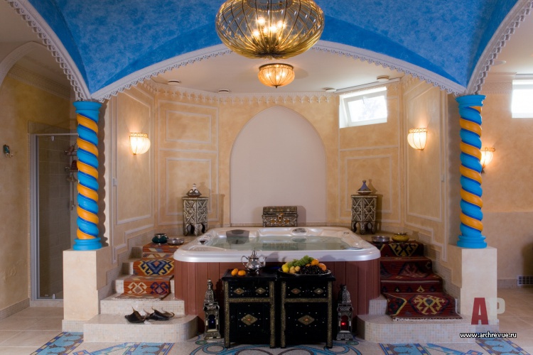 Дом имеет классическую планировку: цокольный этаж занимает зона отдыха с хаммамом, домашним кинотеатром и гидромассажной ванной, оформленная в стилистике марракеш. На первом уровне расположены общественные помещения, выстроенные по принципу анфилады, что создает в доме торжественный настрой. Наверху располагаются приватные помещения.