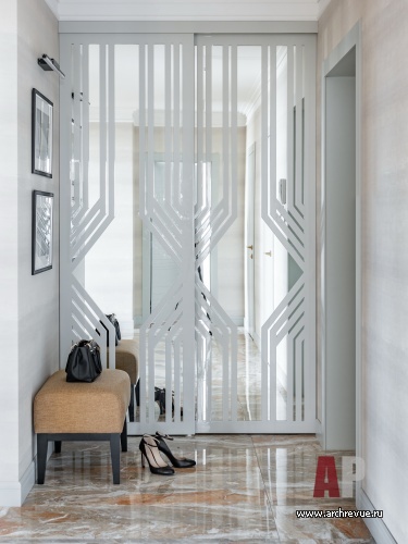 Интерьер квартиры выполнен в современной стилистике с использованием теплой цветовой гаммы и тактильных материалов. Если в гостиной и холле дизайнер стремилась создать настроение солнечного утра золотой осени, то в кабинете – осеннего предзакатного вечера, а в спальне и детской и вовсе передать ощущение первых заморозков с серебристой травой и сиреневой дымкой.