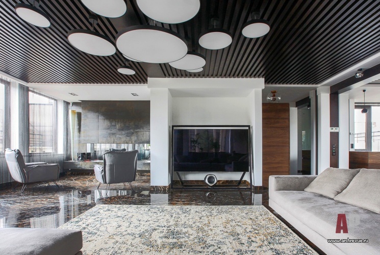 Центральный декоративный элемент гостиной – эффектная потолочная композиция, состоящая из плоских круглых светильников разного размера, смонтированных на реечной деревянной панели. Она задает пространству ритм и масштаб, который поддерживают остальные интерьерные составляющие (например, облицовка пола каменными слэбами крупного формата – 120Х60 см) и мебель. Столовая акцентирована белой плиткой с рельефом, каминная группа выделена серым керамогрантом с фактурой камня. Спальни также выполнены в радикальном современном ключе, в хозяйской спальне жесткость хай-течного оформления смягчает обилие дерева. В лаконичных детских не первый план выходит рациональная и удобная мебель Lago.
