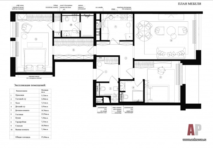 Квартира площадью чуть более 100 кв. метров приобреталась как двухкомнатная, но заказчице требовалось разместить две спальни (хозяйскую и комнату сына), комфортную гостиную, где можно принимать друзей, большую гардеробную и три санузла.