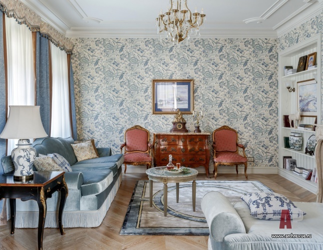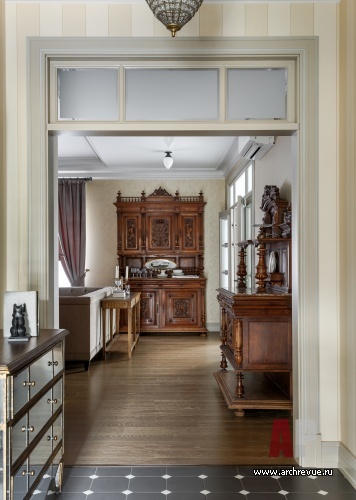 Классическая архитектура поселка располагала к созданию интерьеров с исторической тематикой, автор проекта предложил сделать ставку на классический усадебный стиль: буржуазный, по-хорошему мещанский с многочисленными декоративными подробностями, выполненными на заказ изделиями и антиквариатом. Когда оформление дома было завершено, архитектор благоустроил общий участок и спроектировал комплекс построек: гостевой дом с баней и бассейном, оранжерею, гараж и павильон для барбекю.