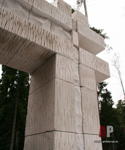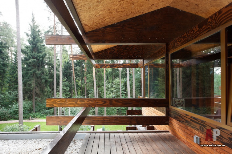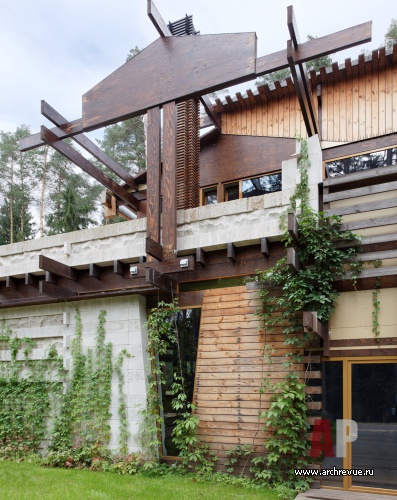 В основе замысла лежит желание раствориться в ландшафте подмосковного леса. Этому подчинены и объемно пространственная композиция ансамбля, и выбор материалов, и конструктивные решения. Объемы распластаны по рельефу, завязаны в некую череду прихотливых мизансцен. Расположенный в лесу дом не открывается взору полностью, а проявляется фрагментарно, каждый раз предлагая новую вариацию архитектурно-пластических решений. В основе образ сосны на известковых выступах. Цокольный этаж частично решен в белом камне, обнаженный деревянный каркас верхних уровней здания продолжает пространство соснового бора: стойки-стволы, балки-путанные ветви, стекло-витраж листвы. Экстерьер и интерьер постоянно меняются местами, так как почти из каждого помещения можно выйти наружу. Дом нет смысла обходить, его проходишь насквозь. Внешняя отделка плавно переходит в интерьер, приглашая природу внутрь.