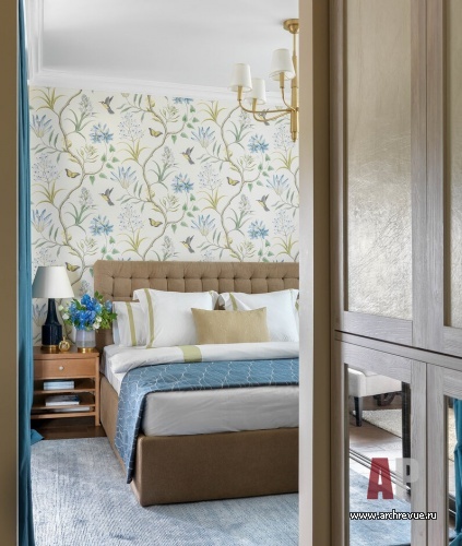 С ней рифмуется бесшовная фреска с сюжетом Morning in the forest и велюровым финишем. Светлая слегка припыленная инженерная доска, декоративная перегородка из выбеленного дуба, текстиль с жемчужным муаром создают ощущение элегантного парижского интерьера. Натуральные природные оттенки, глубокие естественные цвета, использованные в декоре приватных помещений, поддерживают главную декоративную линию и делают интерьер цельным произведением.