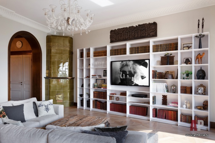 Ритм и форма арочных оконных проемов вдохновили архитектора на создание эклектичного интерьера, в котором присутствуют черты классики, этники и даже лофта. Центральным элементом гостиной стала отреставрированная печь, облицованная старинными изразцами. Единую композицию с ней составляет минималистский немецкий стеллаж и современный угловой диван.