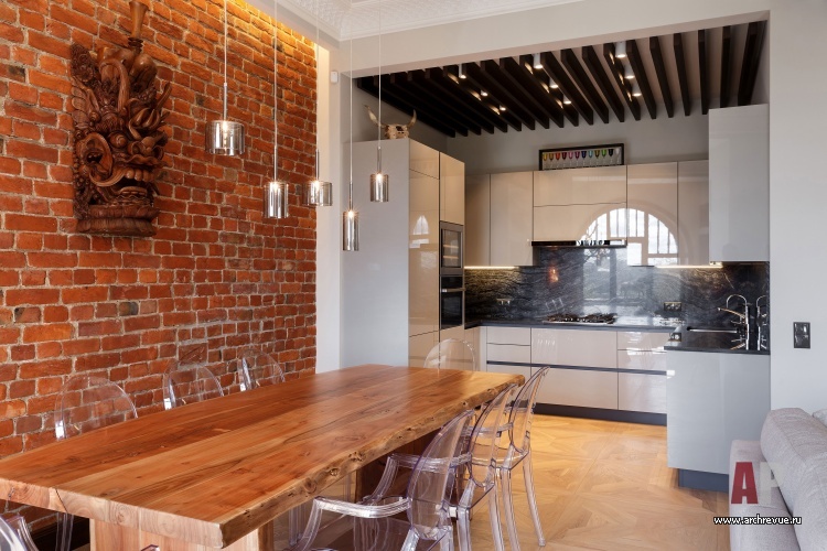 Поскольку родная лепнина была полностью утрачена, питерские мастера воссоздали исторический декор: карнизы, потолочные розетки стали мощными декоративными акцентами интерьера. Чтобы усилить ритм и подчеркнуть графичность интерьера, окна были оформлены накладками из темного дерева, а стены частично облицованы аутентичным красным кирпичом. Декоративные штукатурки с эффектом искусственного старения, деревянная подшивка потолков, массивная резная мебель добавляет интерьеру сходство со старинными итальянскими виллами. А многочисленные этнические предметы делают его сложным и многоплановым.