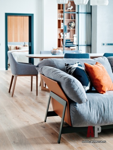 Встроенные шкафы и стеновые панели выполнены из шпона ореха и массива дуба, который добавляет интерьеру красок и вносит природную тему. Яркий декоративный акцент – раздвижная перегородка из черного металла и прозрачного стекла, она зонирует жилой объем и добавляет интерьеру брутальности. Семья ведет здоровый образ жизни и старается все свободное время проводить на природе: природные тона, текстуры и материалы в интерьере помогают лучше настроиться на отдых.