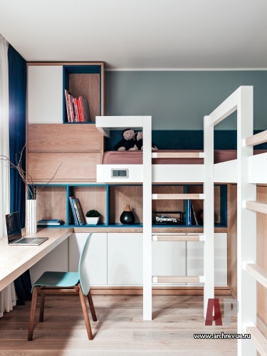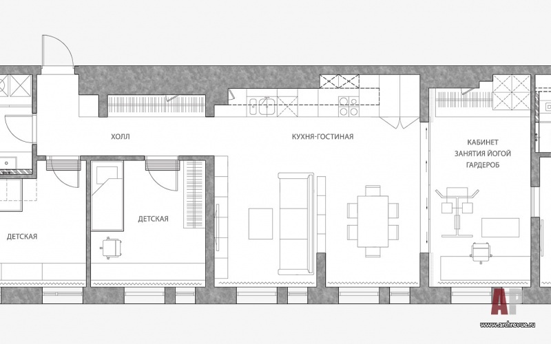 Основная идея проекта – это открытая светлая квартира с минимумом коридоров и продуманной системой зонирования с расчетом на комфортное проживание с двумя подрастающими детьми. Жилые пространства здесь сгруппированы вдоль окон, а санузлы и технические зоны расположены в темной части квартиры. Объем разделен на три блока: справа от входа находятся детские комнаты, в центре – объединенная гостиная, столовая и кухня. К ней примыкает родительская часть: спальня о своей ванной комнатой, а также буферная зона кабинета с функциями зала для занятия спортом и йогой. От гостиной она отделена стеклянными раздвижными дверями, которые работают на образ мобильного пространства.