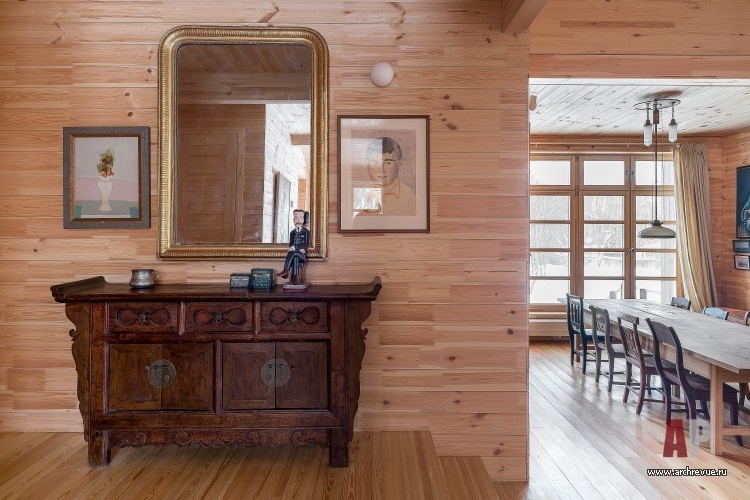 Главная роль в интерьере отведена картинам, поэтому отделка не пестрит разнообразием, а выглядит единой композицией. Стены и потолок всех помещений зашиты сосновой доской натурального цвета, на полу – доска из лиственницы также природного светлого оттенка. Первоначально заказчики хотели выкрасить стены в белый цвет, но поддались на уговоры архитекторов и оставили нейтральный цвет древесины, который стал отличным фоном для яркой, темпераментной живописи.