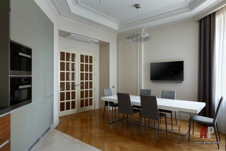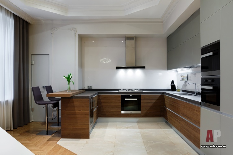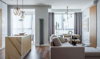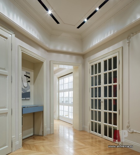 Отправной точкой дизайн-проекта квартиры стало само историческое здание, в котором она находится. За основу была взята современная функциональная стилистика, которую архитектор усложнила неоклассическим декором.