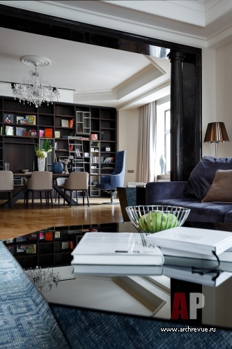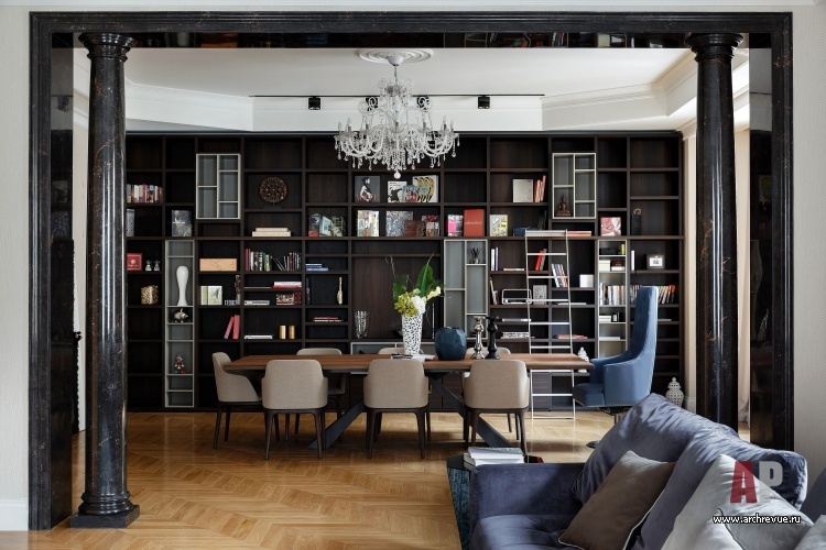 Гостиная библиотека и ТВ-консоли Poliform, диван «Фабрика 8 марта», столики журнальные Cattelan Italia, стол Cattelan Italia, стулья Poliform