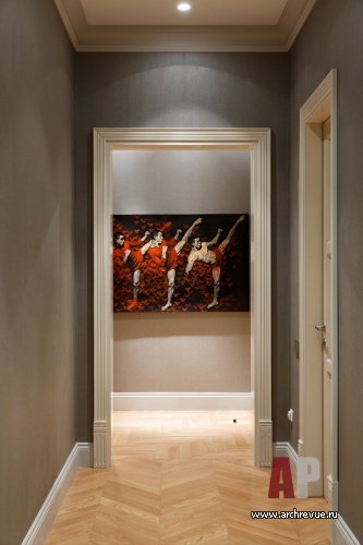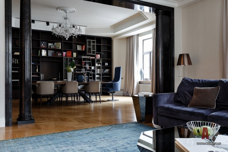 Чтобы поддержать симметрию, архитектор выстроила диагональную ось, которая связала входной блок с общественными помещениями, расходящимися веером от холла. В итоге от входа открывается вид на гостиную с парадными двустворчатыми филенчатыми дверями. С гостиной через широкий проем, который архитектор подчеркнула декоративными колоннами из оселкового мрамора, соединен кабинет с функцией библиотеки. Гостевая спальня находиться при входе, а хозяйская и детская спальни с санузлами и гардеробными в приватной части квартиры. От общественных помещений она отделена внутренним холлом с острым углом, подчеркнутым встроенными потолочными светильниками. При раскрытых дверях пространство имеет сложную ломаную конфигурацию, которую архитектор обыграла с помощью разных материалов и декоративных изделий. Вмешательства в архитектуру квартиры были минимальны: расширение кухни за счет технического помещения, увеличение хозяйской ванной комнаты и уменьшение гостевого санузла. Но результат превзошел ожидания: два смежных холла, совмещенная с кабинетом гостиная, большая изолированная кухня, три спальни, два санузла, вспомогательные помещения – предельно функциональный проект для жизни в городе.