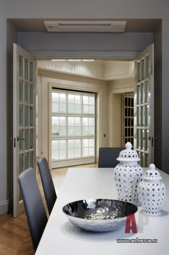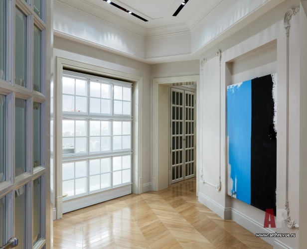 Тонкий лепной декор по стенам, высокие гипсовые карнизы, филенчатые витражные двери, дубовый паркет с раскладкой «елочка» сочетается с предельно современными встроенными светильниками и лаконичной отделкой стен однотонной матовой краской. Поскольку дом стоит в центре проходного двора, то архитектору хотелось добавить света всеми доступными способами: белые двери, светлые финишные окраски, работающий на просвет буфет – каждый элемент на своем месте… На контрасте с фоновым оформлением работаю декоративные акценты и мебель: черные колоны из оселкового мрамора, библиотека, стол для работы и званных ужинов в гостиной, современная кухня, а также предметы актуального искусства. «В результате мне хотелось увидеть просторный и строгий европейский интерьер, который бы не давил на хозяев и позволял им самим наполнять пространство личными вещами и создавать свою, особую историю», - резюмирует архитектор Елена Ли.