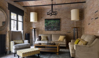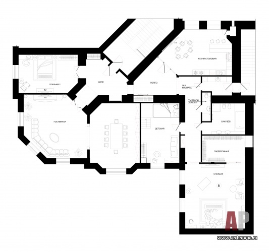 Дореволюционный дом имеет большую историческую ценность, поэтому кардинальную перепланировку осуществлять было нельзя. Все несущие элементы и мокрые зоны остались на месте, действовать приходилось деликатными средствами. Пространственным ядром является холл в виде многогранника, от него расходятся двери в жилые помещения.