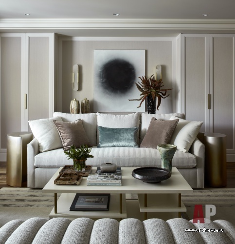 Гостиная диван и кресла Bernhardt, столик у дивана Caracole, журнальный стол Julian Chichester, консоль Global Views, столик у кресла, Eichholtz; стол (столешница – мрамор Calacatta; фасады – кожа Lealpell), на заказ, изготовление Art&Max
