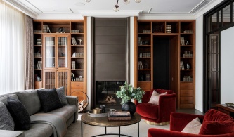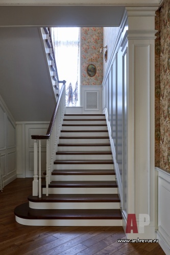 Интерьер дома выполнен в стиле неоклассика с элементами традиционной усадебной стилистики, французской и английской классики. Гостиная, кухня, входная группа выполнены в светлой цветовой гамме: солирует в них дерево с эмалью, выкрашенной в цвет слоновой кости – двери с резными филенками, перегородки с витражными вставками, элегантные стеновые панели.