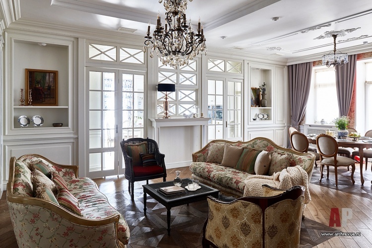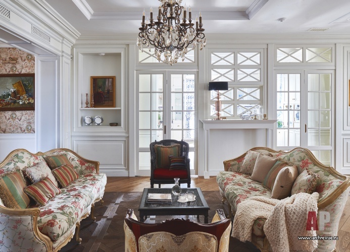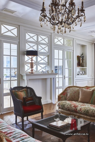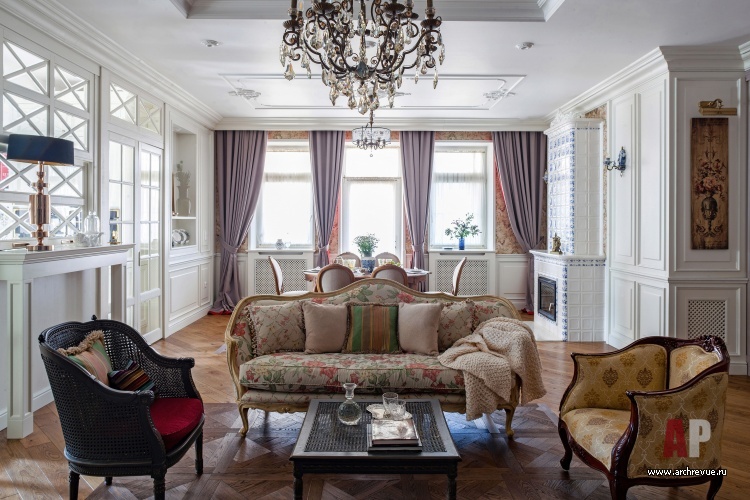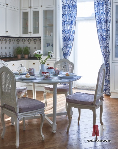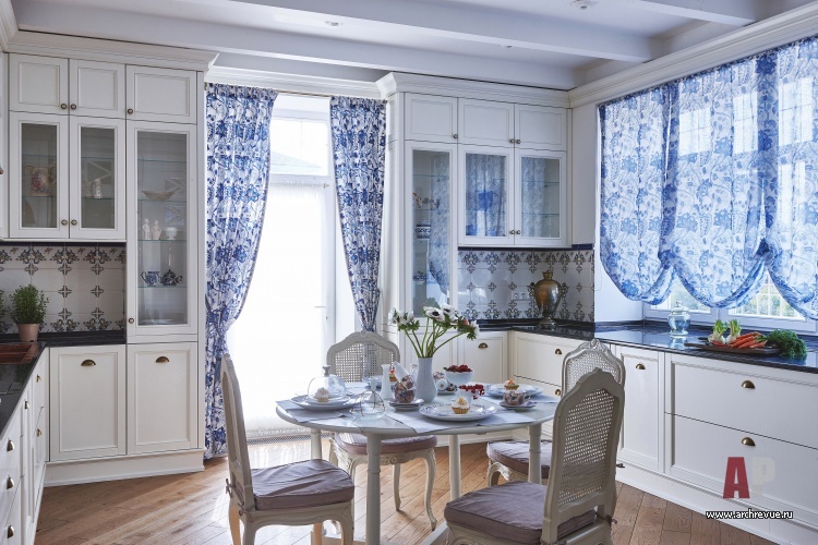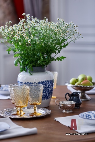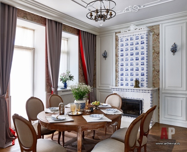 Яркий акцент гостиной – печь, украшенная бело-синими изразцами. Ее поддерживает делфтская столовая керамика и текстиль с гжельским орнаментом. Настроение старой дачи создают антикварные предметы: французские диваны, обитые тканью с пышными цветами, плетеные кресла, хрустальные дворцовые люстры.