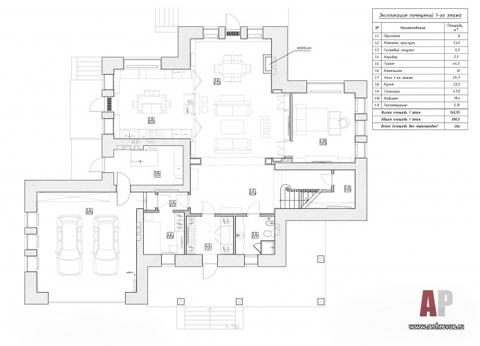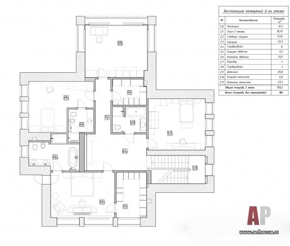 На одной оси с диванной группой расположены выходы в смежные помещения: функциональную кухню с удобной зоной для приготовления пищи и столиком для завтраков, а также кабинет хозяина дома. К входному блоку примыкает гостевой санузел, гардероб для верхней одежды, технические помещения и выход в гараж. Второй этаж занимают хозяйские помещения: главная спальня, две детские и игровая, гардеробные и ванные комнаты.